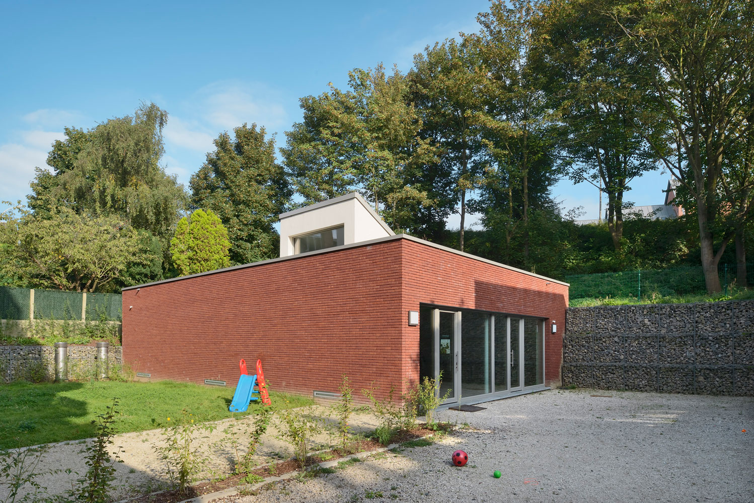 Dans le même esprit, l’accessibilité et la distribution des logements est assurée par un ascenseur extérieur et un dispositif de coursives en façade avant ; l’ensemble des circulations étant donc hors enveloppe thermique et en relation directe avec la rue. Le projet encourage également les modes de transport doux; notamment en intégrant un grand parking pour vélos au niveau du rez-de-chaussée à disposition de tous les utilisateurs du bâtiment. Le fond de la parcelle, constitué d’un talus arboré, est préservé et associé au projet au travers de l’aménagement paysager du jardin. La toiture de l’espace communautaire en milieu de parcelle est végétalisée de manière à s’intégrer à ce massif arboré. Cette conception permet de créer ainsi une continuité intéressante de la biodiversité existante.