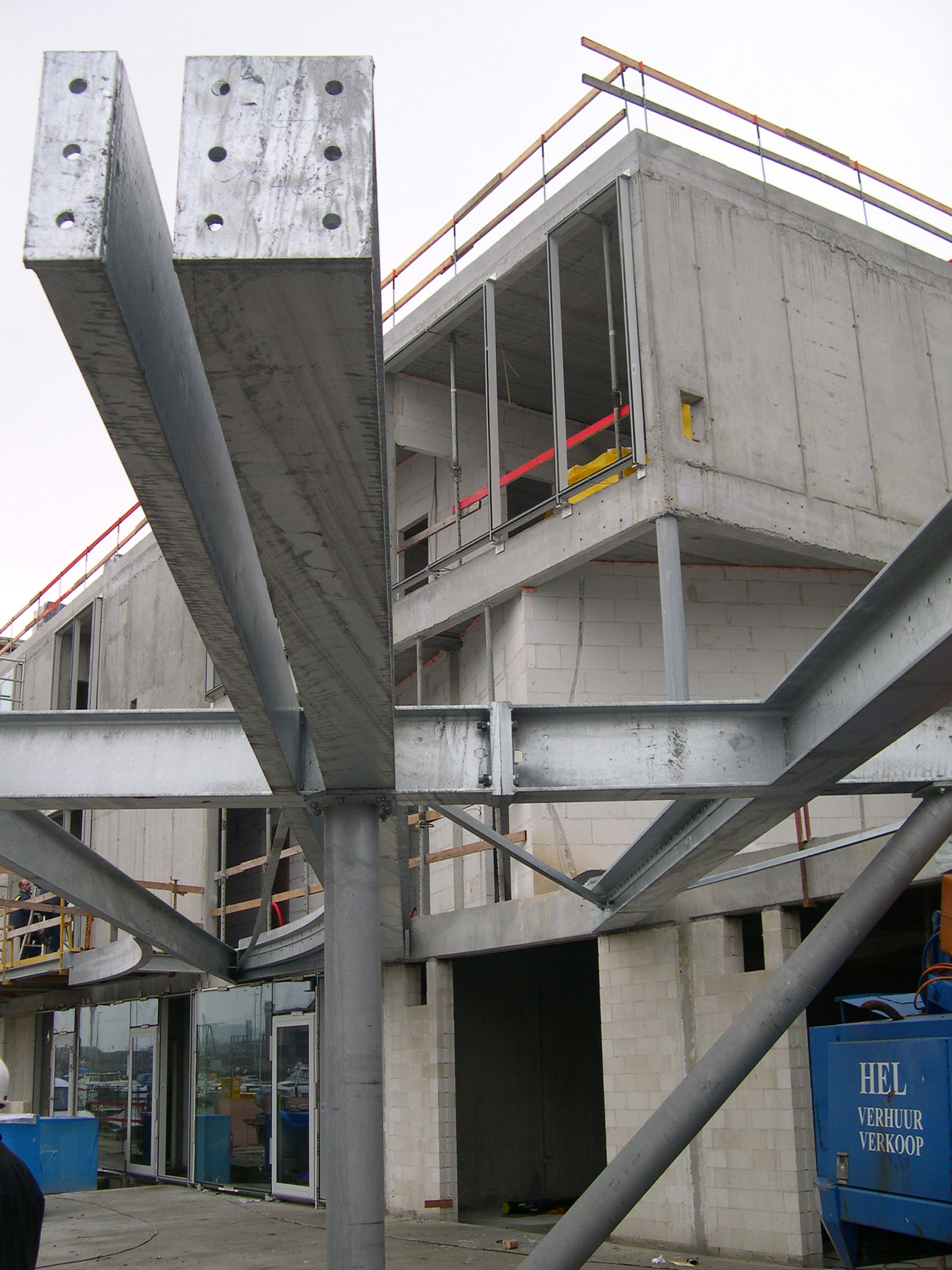 Une partie de l’ossature du batiment est en béton, recouverte d’un bardage en acier, et l’autre partie de l’ossature (qui elle est visible) est en acier galvanisé partiellement recouverte de bardage. De par la configuration des lieux, l’implantation a conduit à imaginer un bâtiment tiraillé entre son ancrage et son ouverture au large, une sculpture sur un socle, le tout dans un mouvement fluide inspiré autant par sa situation que par sa finalité – le monde de la mer et de ses bateaux. Le batiment est bordé coté canal par une coursive d’agrément qui se prolonge par une large terrasse au dessus de l’eau. L’extrémité de cette terrasse permet la surveillance des activités nautiques sur le canal. Cet ensemble est également en acier galvanisé. Les garde-corps sont constitués de structures en acier inoxydable ; le remplissage étant réalisé en métal déployé galvanisé. Il en est de même également pour tous les faux-plafonds extérieurs constituant les parachèvements de la structure métallique galvanisée tout en la laissant apparente grâce à la transparence du métal déployé. Toute la partie du bâtiment qui surplombe les quais et le canal a donc été conçue en ossature métallique, raccrochée à la partie en béton du bâtiment (« faisant contrepoids »). La structure métallique prolonge et étend le rez de chaussée vers le canal via une large courbe qui a pu être réalisée grâce à l’usage de l’acier. Cette ossature longue de 25m qui surplombe le quai et l’eau repose uniquement sur trois colonnes et bracons, et offre un grand porte-à-faux au dessus de l’eau. Cette imposante structure a été assemblée au sol sur le quai de Hembeek et mise en place à l’aide d’une lourde grue mobile.