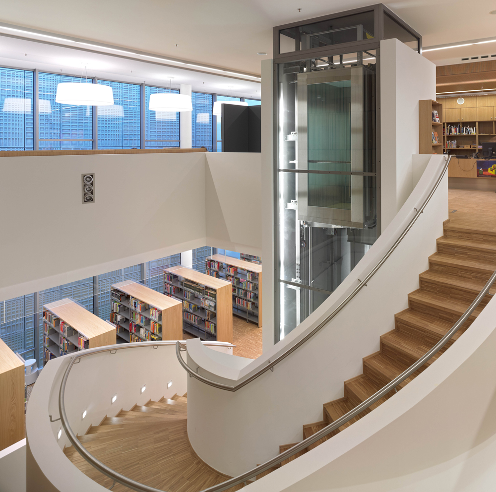 La médiathèque est répartie sur 3 niveaux et dispose d’un patio habillé par une