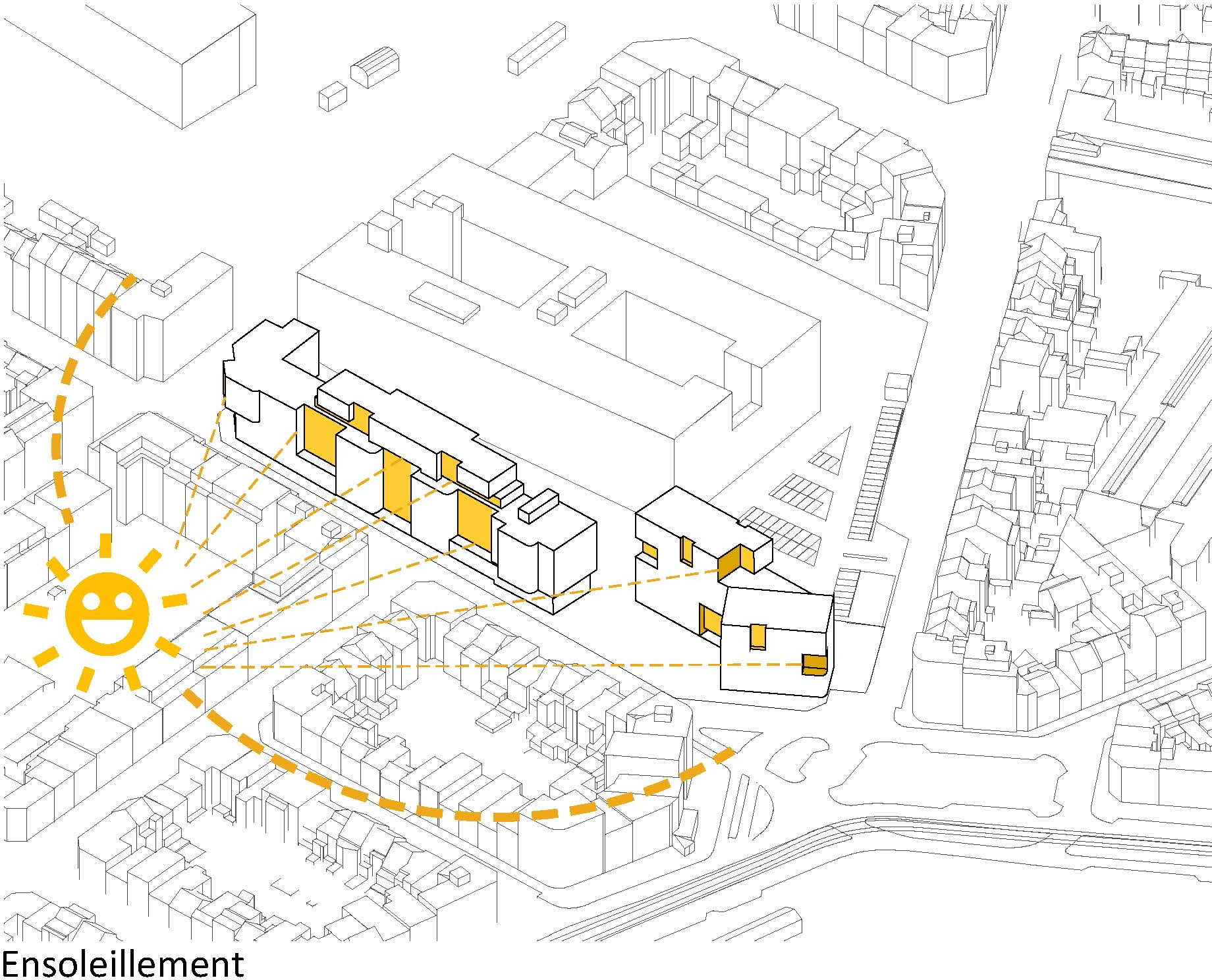 La percée entre les deux immeubles lie la rue van Kalck à la rue de Koninck et ouvre la perspective sur la façade latérale-est du Lavoisier avec un bel apport de lumière du sud. Le schéma a été suivi dans sa logique d’implantation. Le cadrage de la séquence urbaine sur la place Jef Mennekens avec un nouvel immeuble de même gabarit R+5 crée aussi la relation à la rue de Koninck. Outre la percée entre les deux bâtiments, le retrait imposé sur la rue van Kalck a été amplifié pour créer une vraie respiration dans la rue. On profite alors d’une belle zone d’accroche du programme, un espace d’accès extérieur en exposition plein sud. Point de jonction extérieur entre les deux bâtiments de logement, percée perspective sur le Lavoisier en arrière-plan, les volumes se décrochent tant en plan qu’en élévation pour s’accorder aux gabarits hétérogènes du contexte et leur donner sens et logique urbaine.