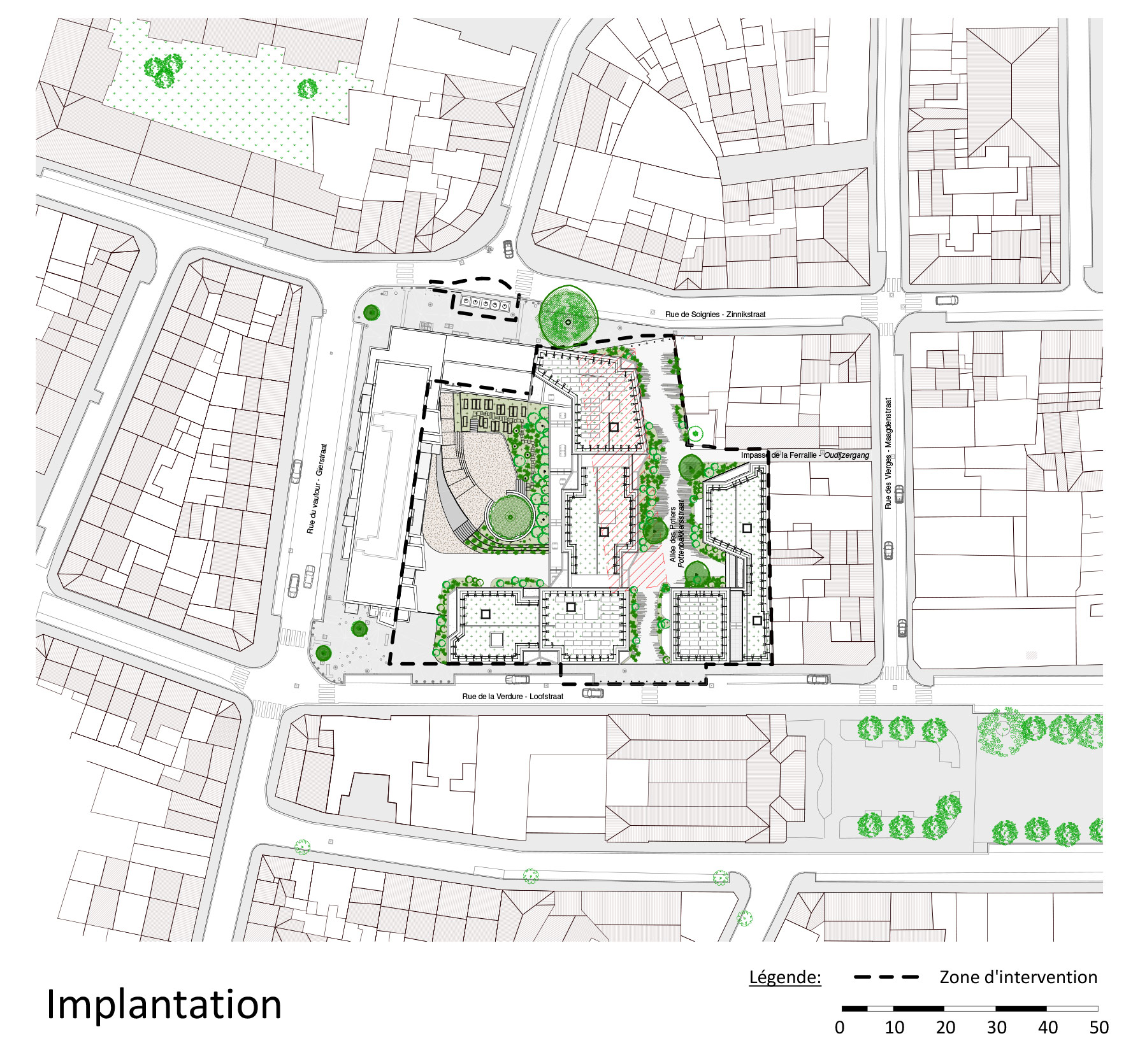 La rue piétonne des Potiers se veut un espace propice à l’échange et la rencontre. L’implantation des gabarits qui l’entourent créé des contractions et dilatations de l’espace offrant des séquences visuelles riches qui invitent à la déambulation. Ce nouvel environnement permet également l’intégration de l’impasse de la ferraille à son nouveau contexte urbain. Un grand nombre de terrasses et séjours en façade ainsi que différentes entrées aux logements au RDC font vivre cet espace.
